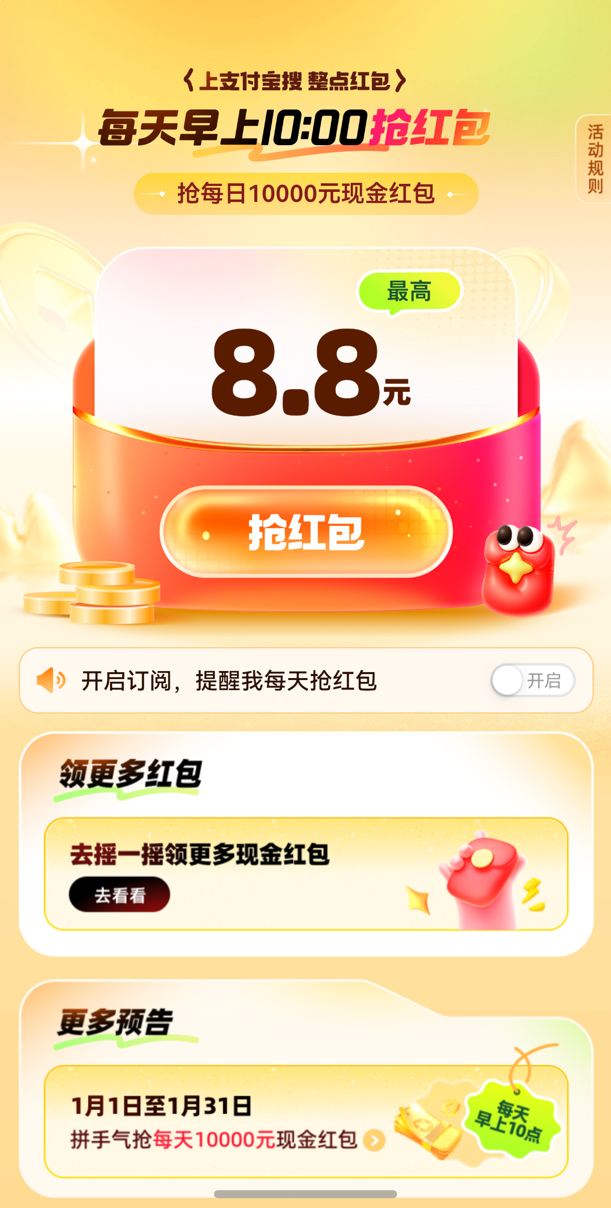 正文 支付宝整点红包 小淘社长 V管理员 /2026-01-08 /11 阅读 0108 文章最后更新时间2026年01月08日,若文章内容或图片失效,请留言反馈! 支付宝整点红包可薅,每天上午10点准时开抢。活动持续到本月31号结束。红包抢到之后直接到账余额。进入支付宝搜索『整点红包』 -- 展开阅读全文 --