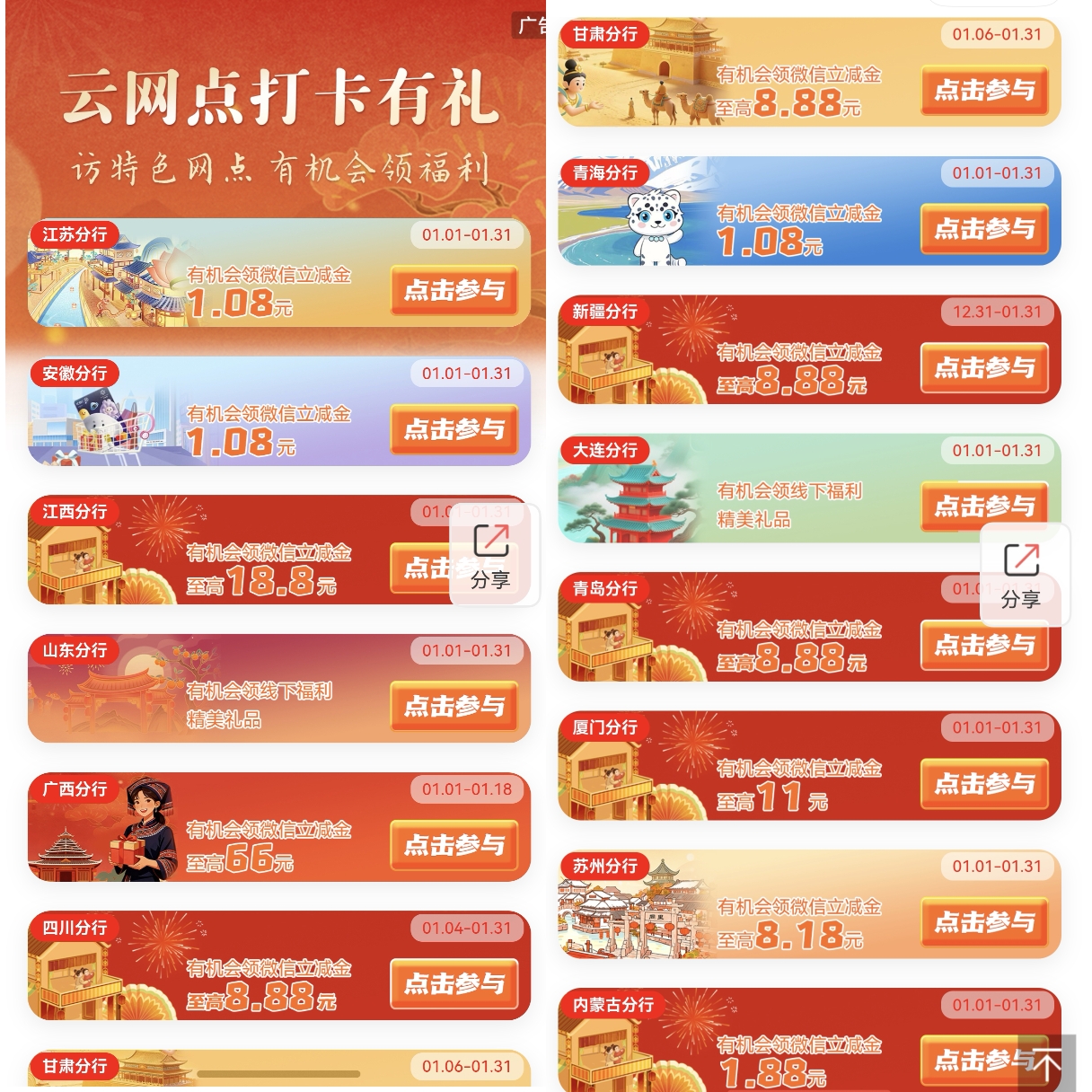正文 工行福利持续更新 小淘社长 V管理员 /2026-01-08 /12 阅读 0108 文章最后更新时间2026年01月08日,若文章内容或图片失效,请留言反馈! 今天继续给大家分享工行的活动,前面工行的活动有很多还可以继续参与,大家没事可以看看我前几天的介绍。今天给大家分享一下工行的“云网点打卡有礼”活动。“云网点打卡有礼”活动大家可以微信搜索小程序『工行服务』进入页面,找到“云网点打卡有礼”活动。直接点此进入活动页面,看看自己所在地工行是否有这个活动,有的话直接点击参与即可。 -- 展开阅读全文 --